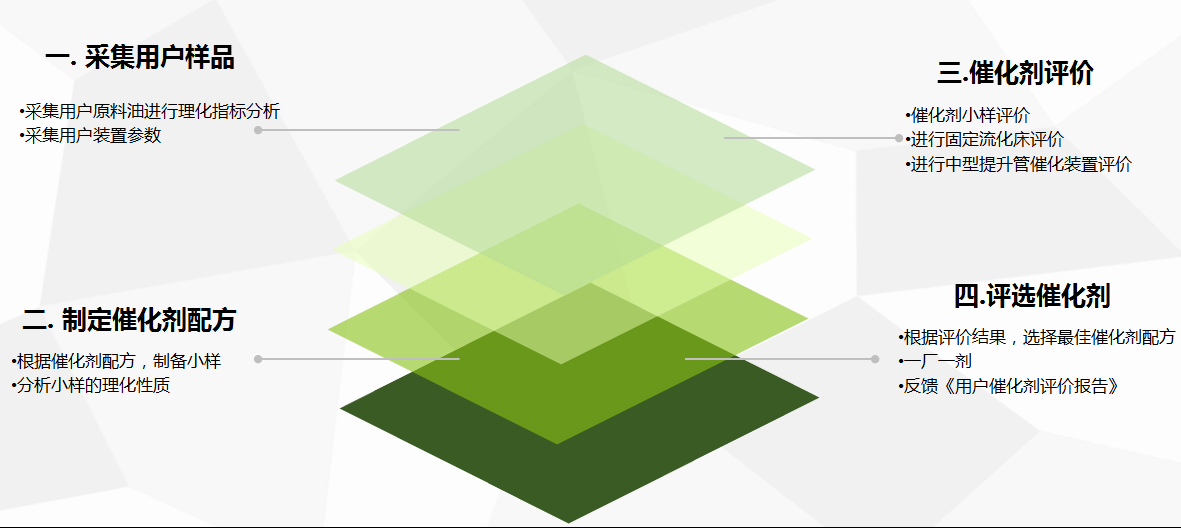 銷售人員負(fù)責(zé)售前采集客戶生產(chǎn)工藝數(shù)據(jù)、原料油樣品等,然后交由技術(shù)服務(wù)中心分析,研發(fā)部根據(jù)分析結(jié)果制備催化劑小樣,通過重油微反實(shí)驗(yàn)裝置、固定流化床實(shí)驗(yàn)裝置和中型提升管催化裂化裝置,對催化劑配方篩選和工藝效果實(shí)施三級評價(jià),根據(jù)評價(jià)結(jié)果靈活調(diào)整催化劑配方重復(fù)試驗(yàn)并選定最優(yōu)方案交由生產(chǎn)管理部實(shí)施定制化生產(chǎn)。